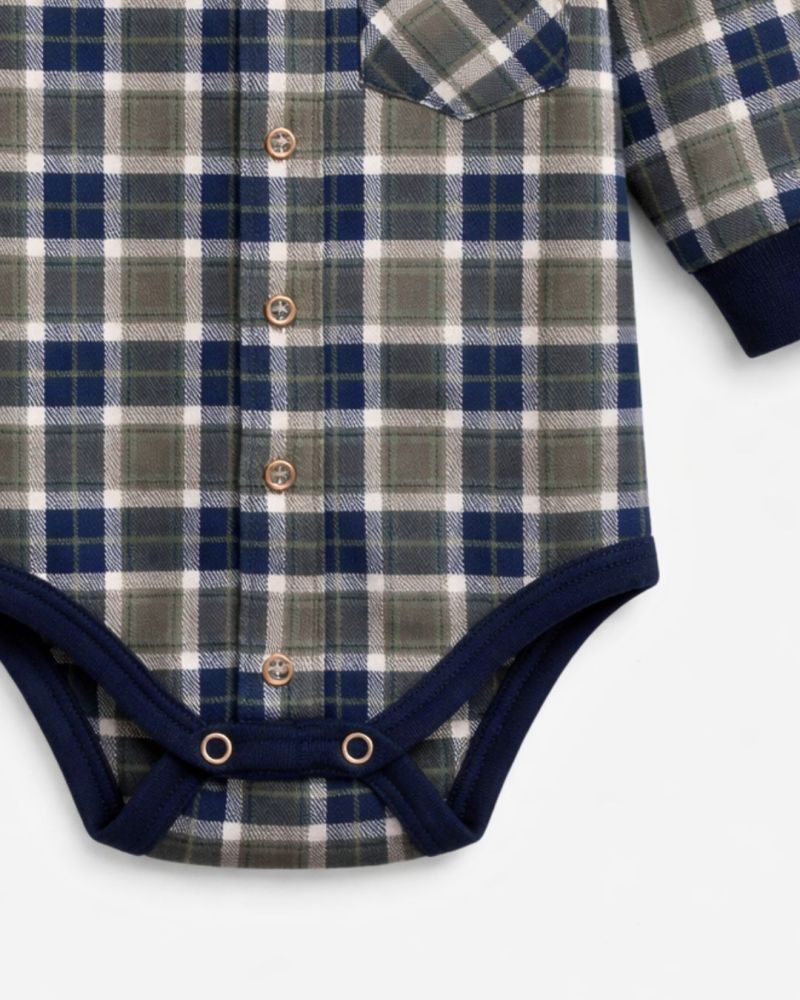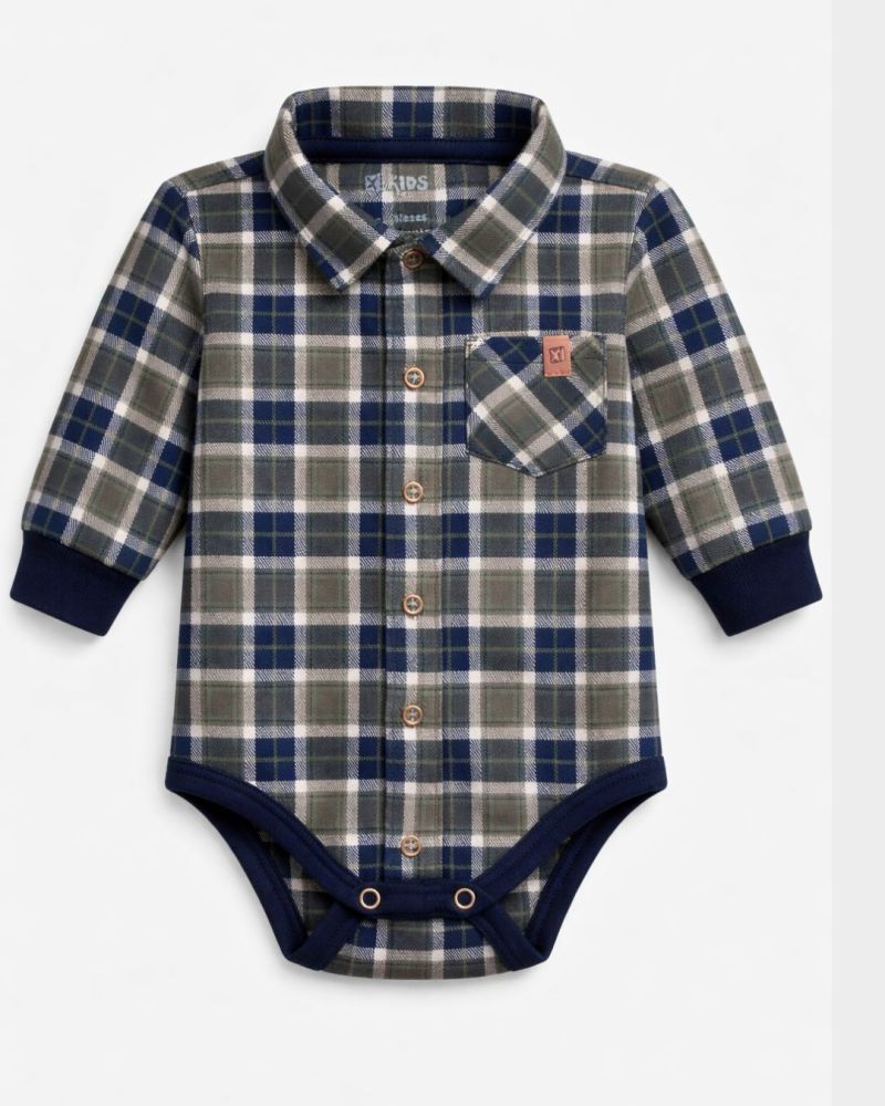 O Body Xadrez é uma peça clássica e atemporal, que nunca sai de moda. Seu design versátil permite criar diversos looks estilosos para o seu bebê, com conforto e praticidade. Confeccionado em flanela quentinha o modelo conta com bolsinho frontal, gola colarinho e abertura com botões na parte da frente, trazendo charme e praticidade. Possui também fechamento entre as pernas, facilitando na hora de vestir e trocar o bebê. Os botões de pressão não enferrujam, garantindo mais durabilidade e qualidade para a peça.