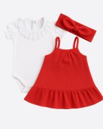 Para completar o visual, acompanha um vestidinho canelado vermelho com alcinhas finas e babado na barra, trazendo charme e movimento ao look. O tecido canelado tem toque macio, elasticidade e caimento perfeito. A faixa de cabelo combinando finaliza o kit com um toque ainda mais delicado.