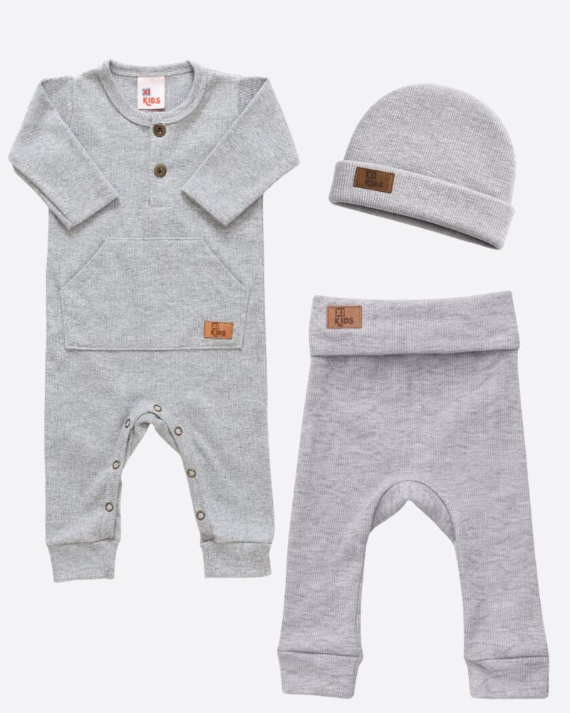 Kit confortável e prático para o dia a dia do bebê. Composto por macacão, calça e touca confeccionados em malha canelada de alta elasticidade, que se ajusta delicadamente ao corpo do bebê, proporcionando toque macio e liberdade de movimento.