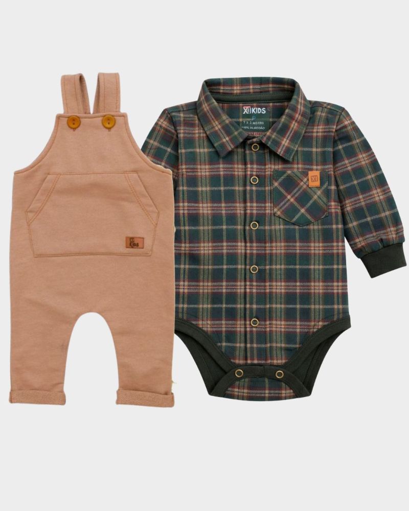 Kit Jardineira Bege Bebê com Body Xadrez Verde