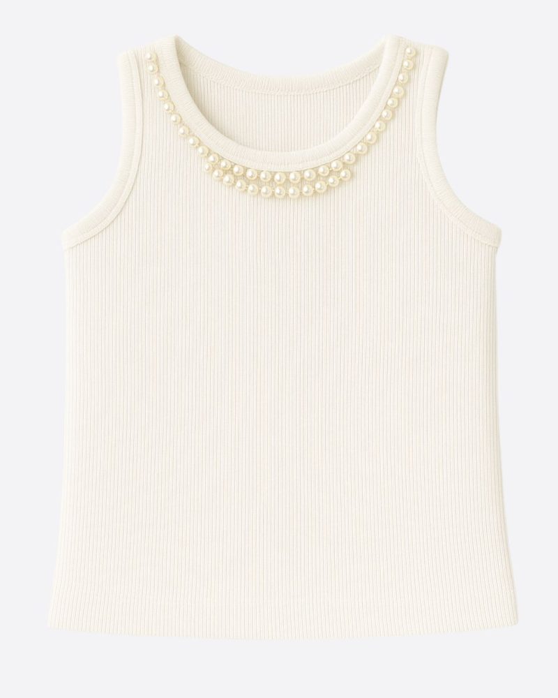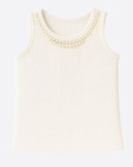 A Regata em pérolas traz uma leitura elegante do básico: malha ribana com elasticidade na medida certa e toque macio, com caimento e sem apertar nada. O decote recebe duplo bordado de pérolas off, alinhadas uma a uma (não soltam). Uma peça linda para compor looinhos